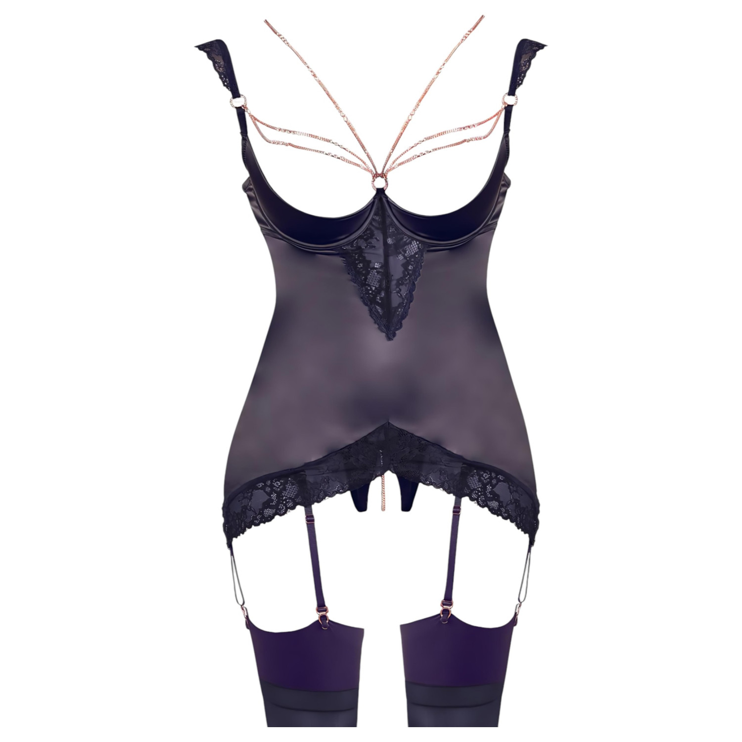 Šis īpašais komplekts ir sievietes skaistuma un seksuālās elegances nevainojama kombinācija. Pacalošā konstrukcija skaisti veido krūtis, bet spīdīgās ķēdes rotājums izceļ dekoltē kā īsts juvelierizstrādājums. Nedaudz elastīgais, ērtā materiāla nodrošina, lai valkājot, tas būtu ne tikai erotisks, bet arī ērts.