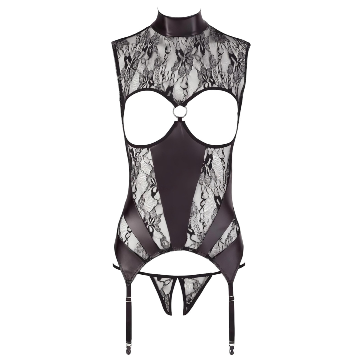 Atvērta krūštura daļa nodrošina izaicinošu un juteklisku izskatu, kamēr augstā apkakle izstaro eleganci un izsmalcinātību. Lielais strasa gredzens pievieno īpaši interesantu vizuālo elementu, un regulējamās zeķturu siksnas parūpējas par pielāgojamu piegulšanu. Komplektā ietilpst stringi ar atvērumu intīmajā zonā, kas vēl vairāk pastiprina vilinājumu.