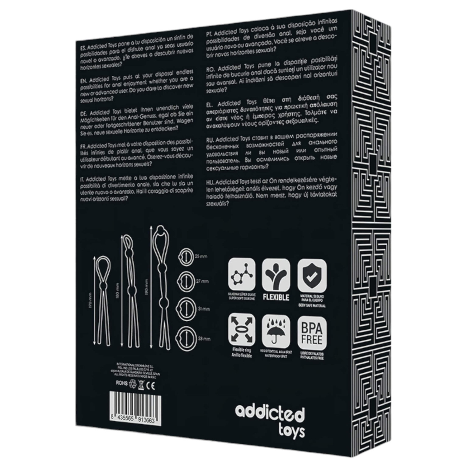 • 3 gab. ar slīdni regulējami erekcijas gredzeni (17, 18 un 19 cm gari)