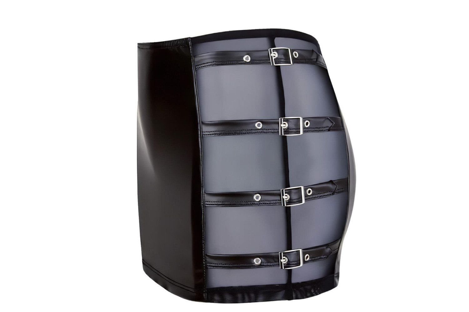 • 1 gab. melns mini svārciņš ar caurspīdīgiem neca ielaidumiem un metāla sprādzēm.