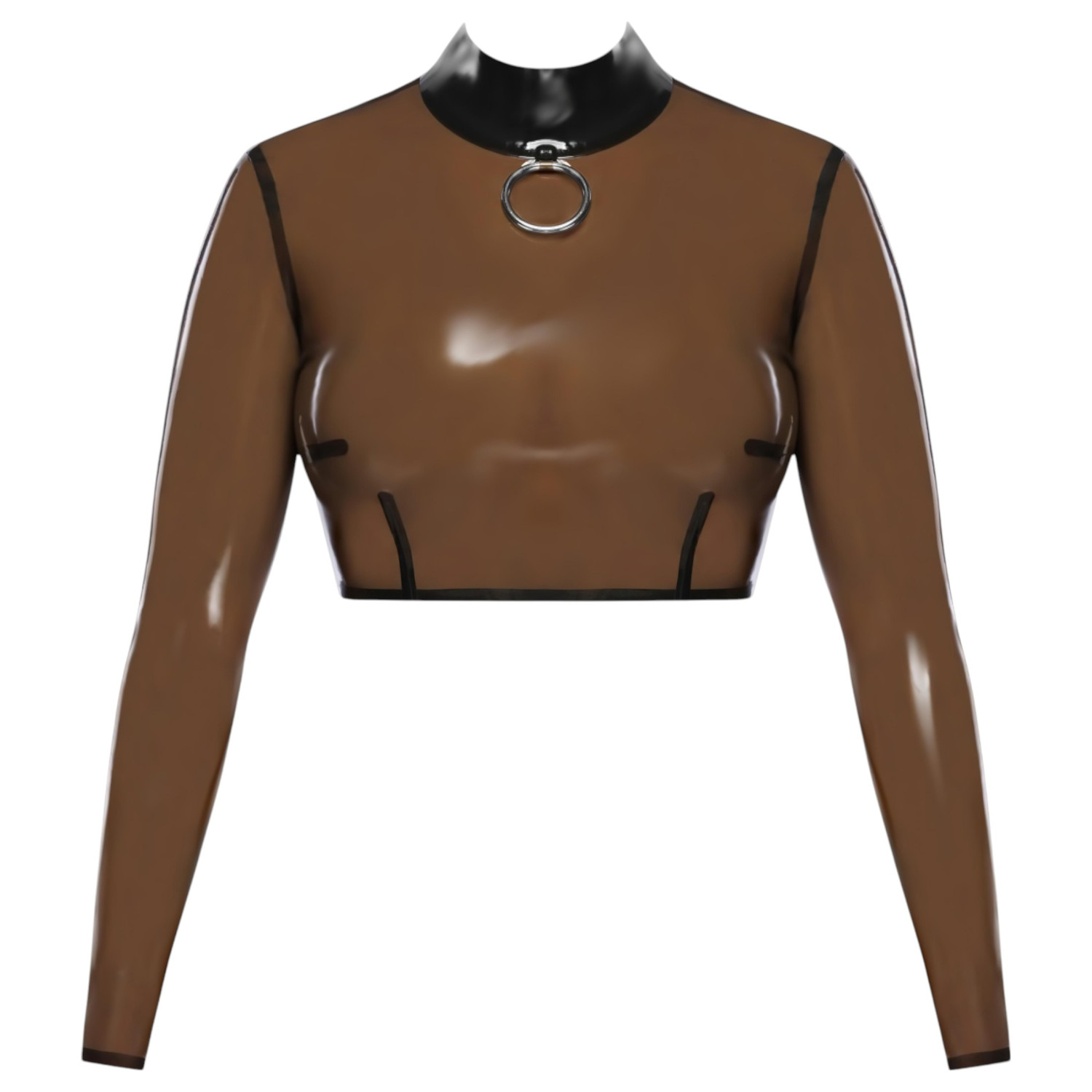 • 1 gabals caurspīdīgs, garu piedurkņu lateksa crop tops ar metāla riņķi apkaklītei