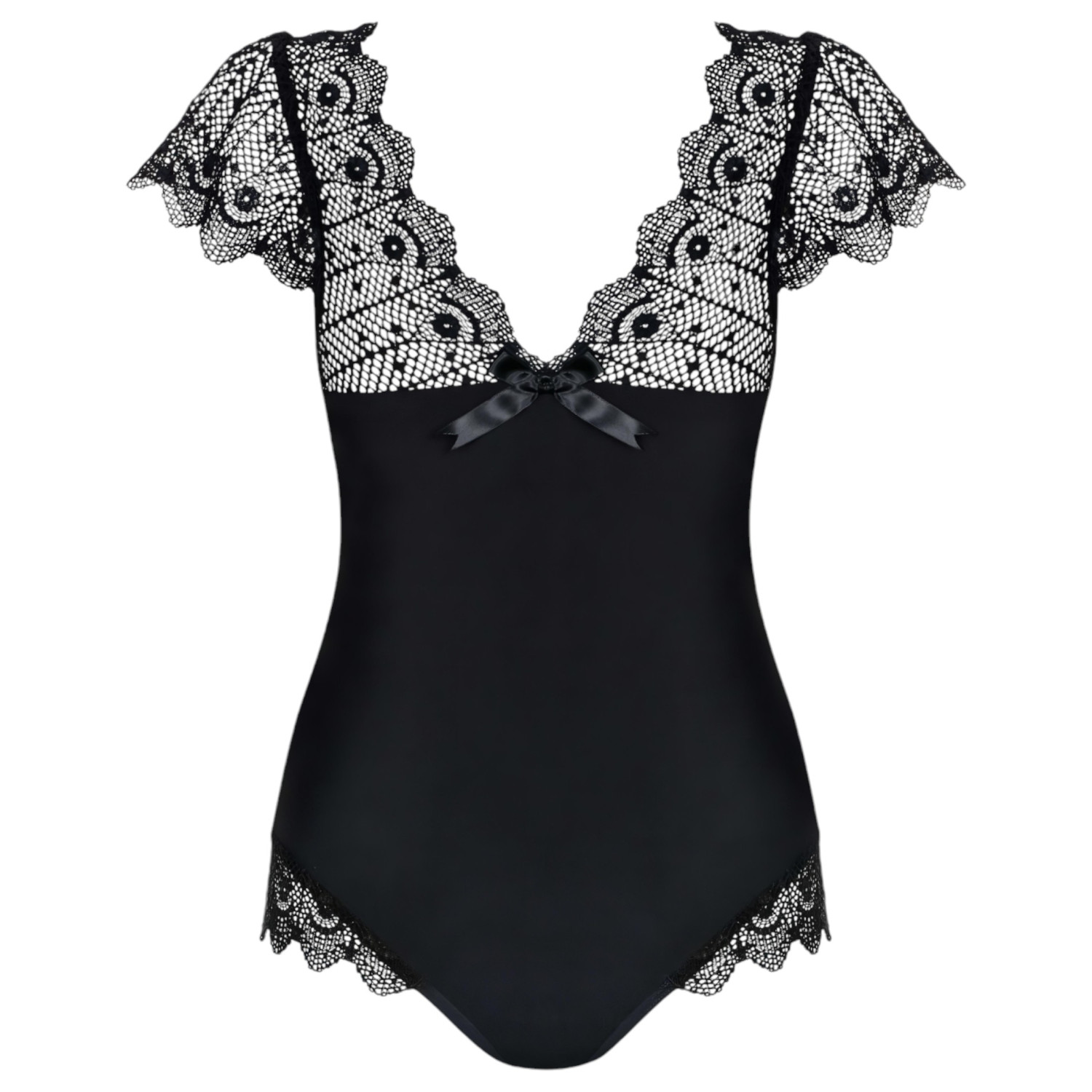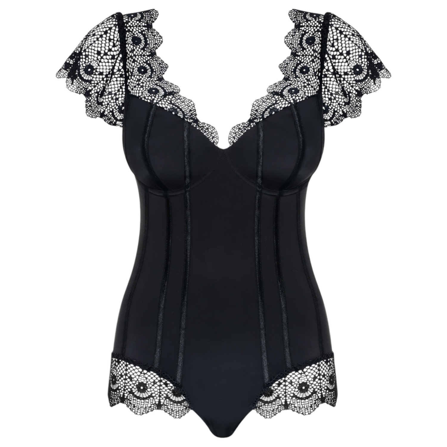 Viedokļi Obsessive Moketta - melna mežģīņu un svītrainu volānu bodijs - L/XL