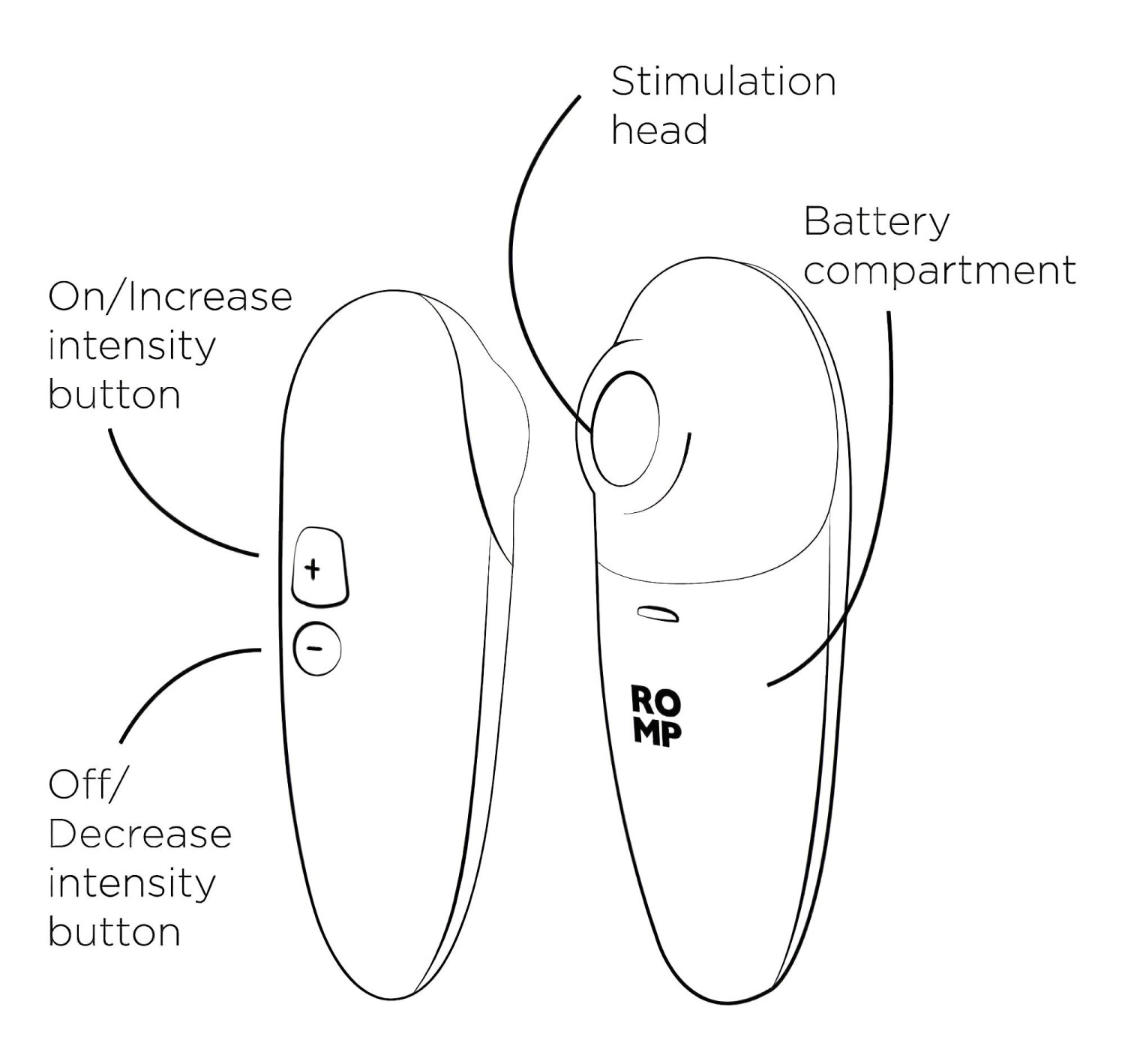Uz stimulatora uzgaļa un klitora uzklāj ūdens bāzes lubrikantu un sāc baudīt. Nospied un turi + pogu 2 sekundes, lai ieslēgtu ROMP Switch X. Uzliec stimulatora uzgali uz klitora ar vieglu spiedienu. Izvēlies sev piemērotāko no 10 intensitātes līmeņiem ar + un - pogām. Lai izslēgtu ierīci, turi - pogu 2 sekundes.