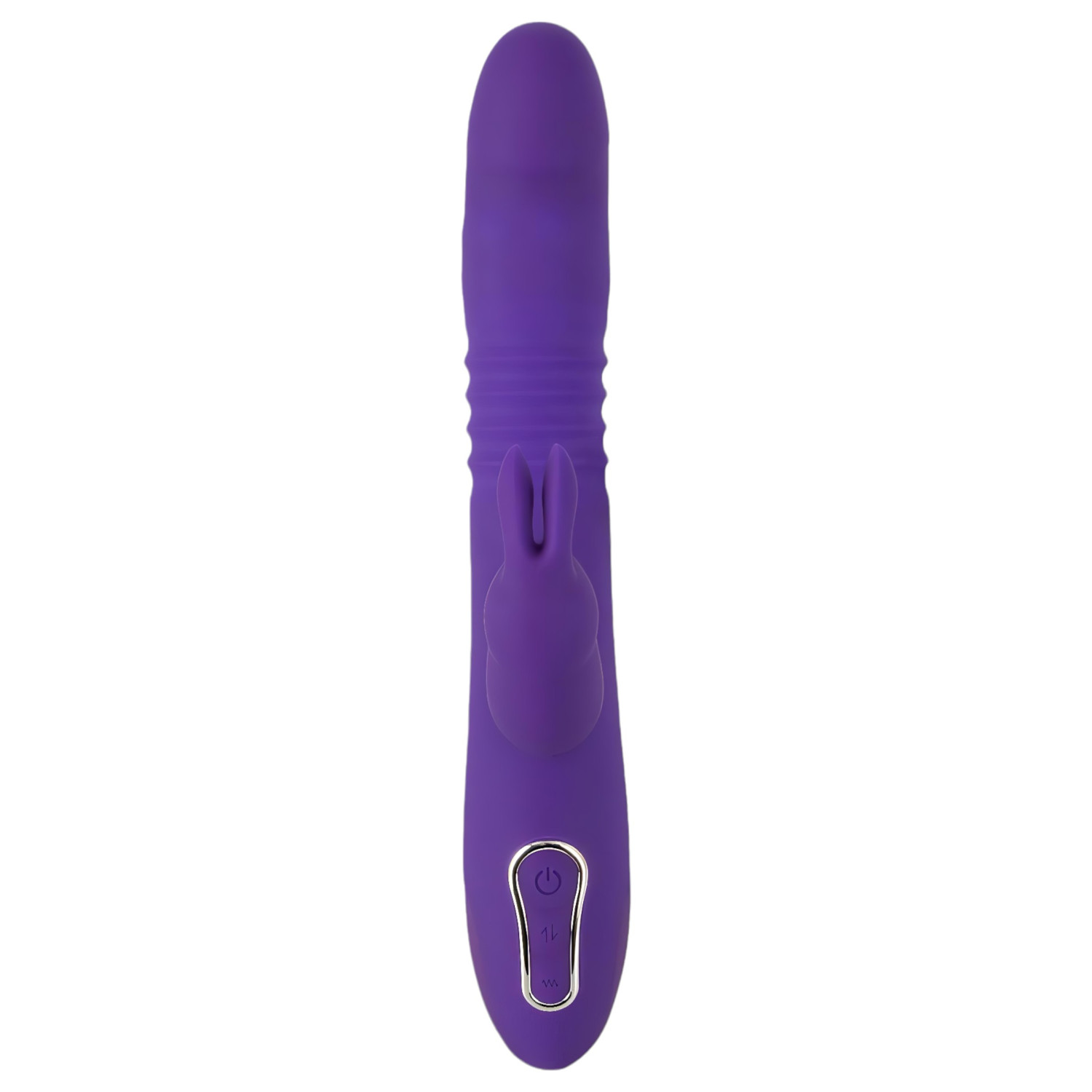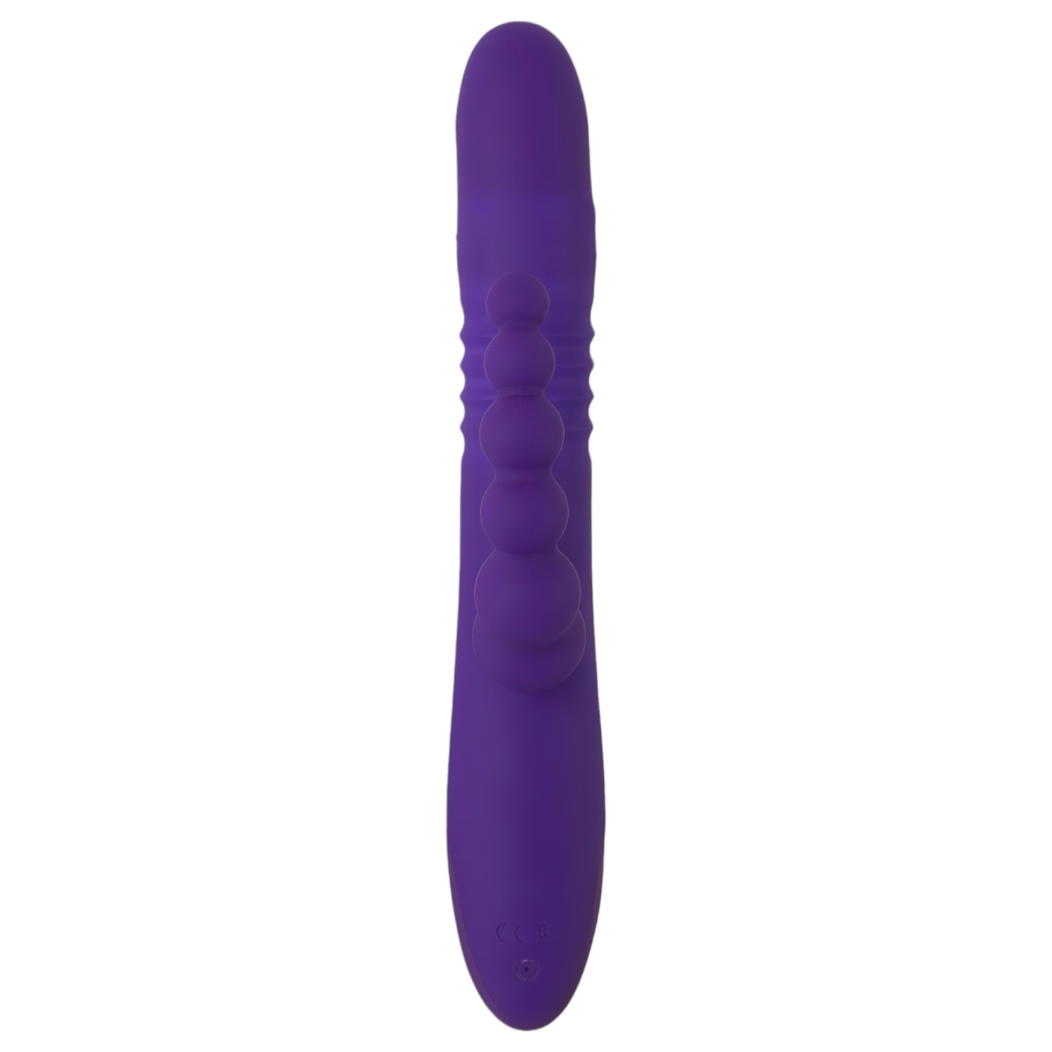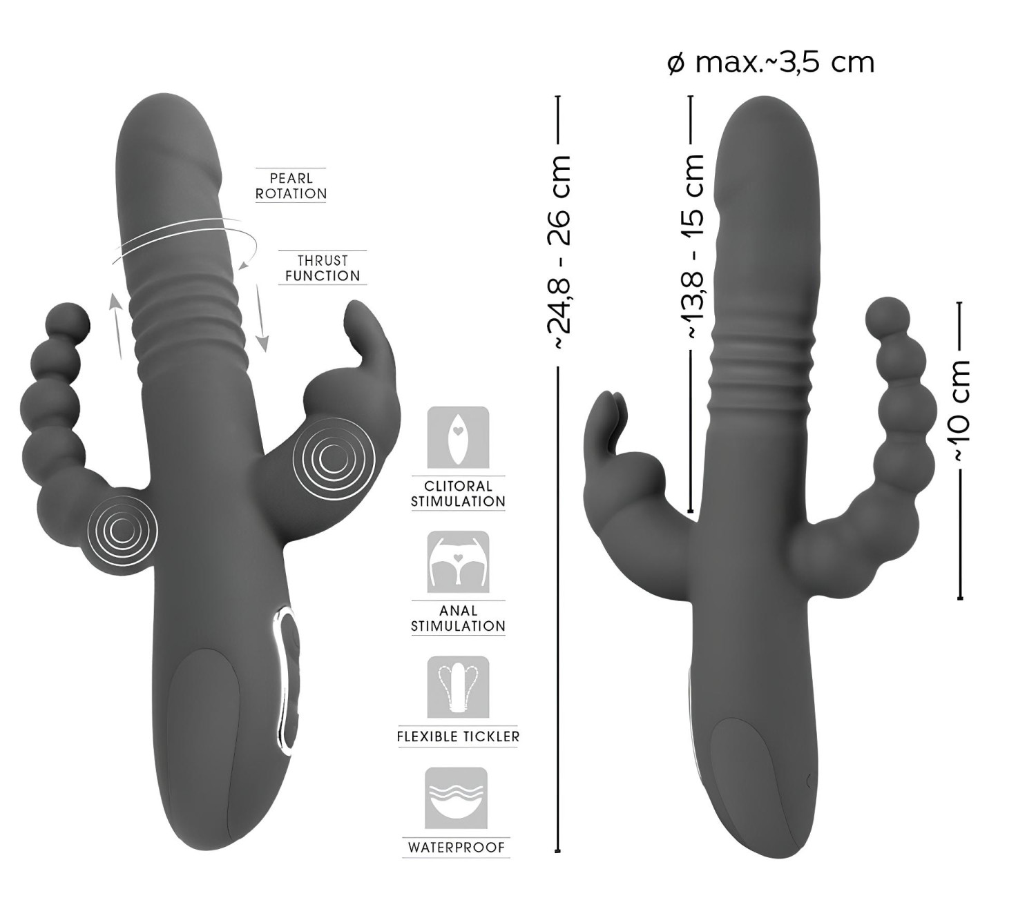 Ciets pamatne, pārklāts ar samtaini maigu silikonu, trīskāršs vibrators ar elastīgu truša ausu klitora stimulatoru un lodīšu anālo rokturi. Trīskāršam baudījumam!