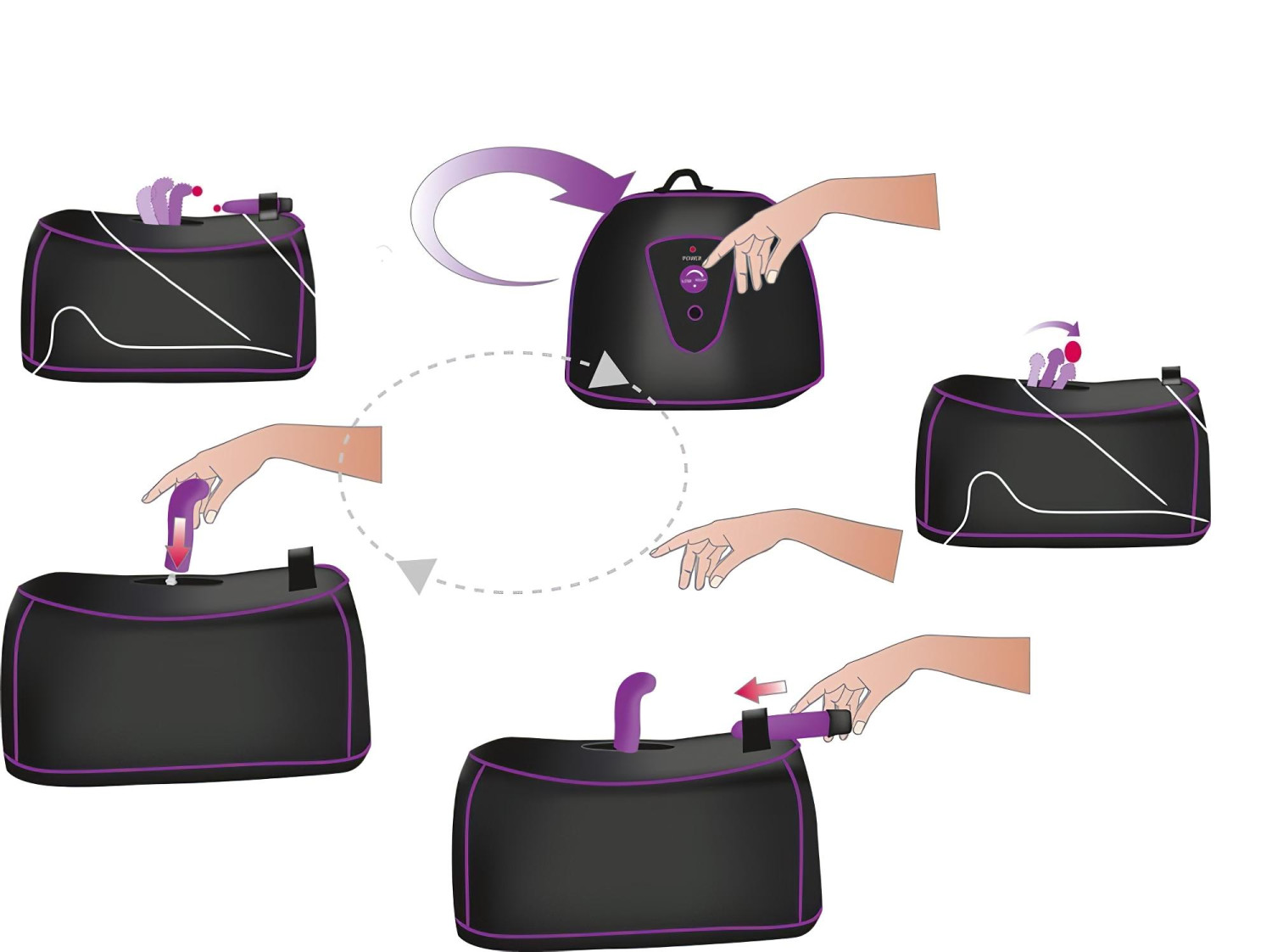 Izvēlies vēlamo silikona uzgali, ievieto to paredzētajā vietā un pieslēdz mašīnu tīklam. Ar sānos esošo grozāmo pogu vari noregulēt tieši sev piemērotu rotācijas ātrumu. Ja vēlies vēl vairāk stimulācijas, ievieto komplektā pievienoto rūti vibratoru speciālajā nodalījumā un izbaudi dubultu baudu!